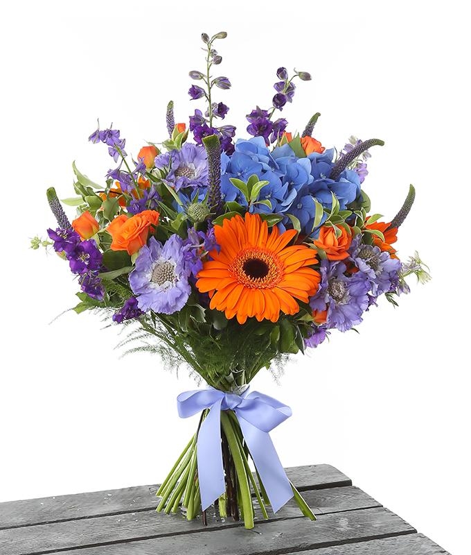 Bright and summery orange and blue hand tied bouquet including orange gerbera, lilac scabiosa, purple veronica, purple larkspur and orange spray roses.