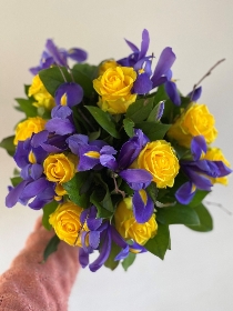 Send a touch of joy and happiness with these yellow roses Penny Lane roses, iris, birch and foliage.